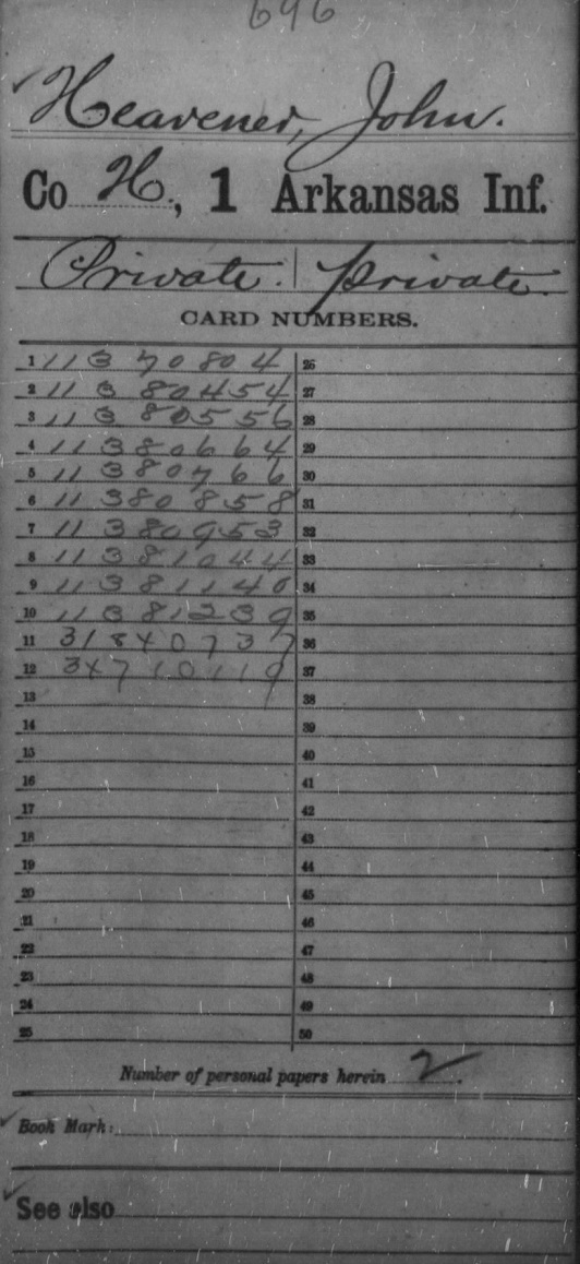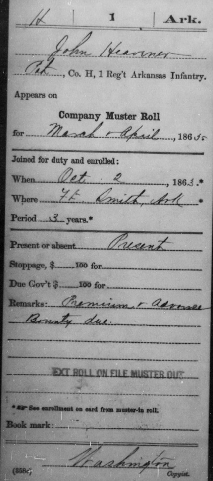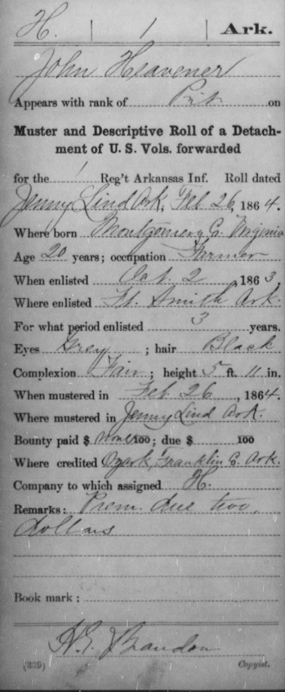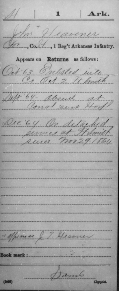 John enlisted in the Union Army in Co H 1st Inf October 2, 1863 at Fort Smith, Sebastian