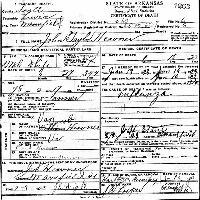 John passed away January 18, 1923 at Sebastian Co., Ar. with his burial at