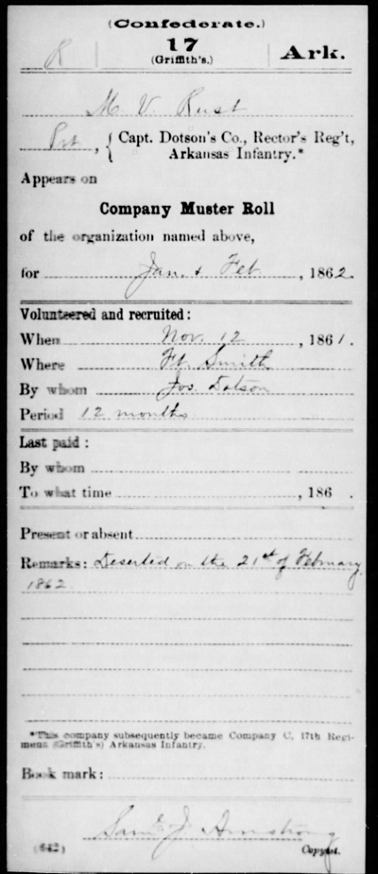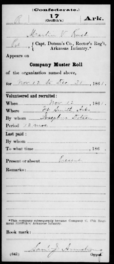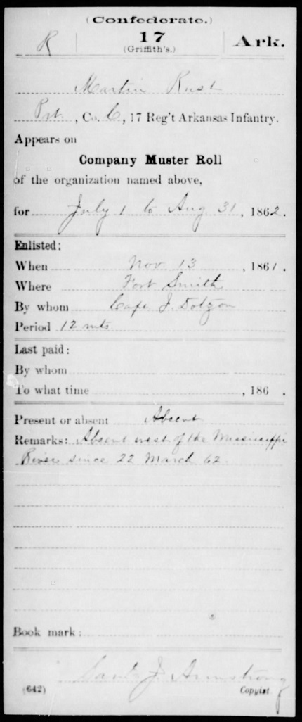 1st Ark. Infantry Co. F. Some of his muster records are below.
