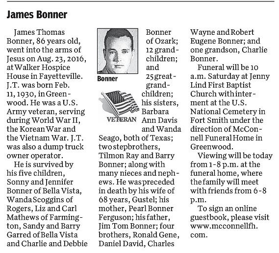 James Thomas "J.T." Bonner, Jr. was born February 11, 1930 at