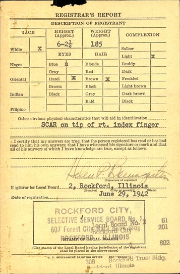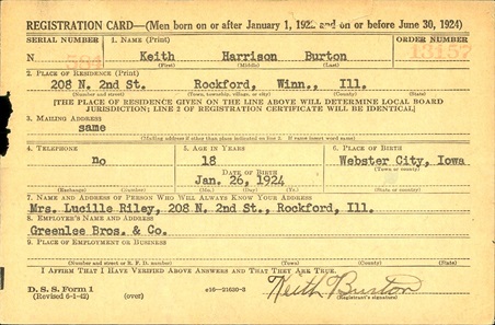 On June 29, 1942 Keith registred for the military draft at Rockford, Illinois.