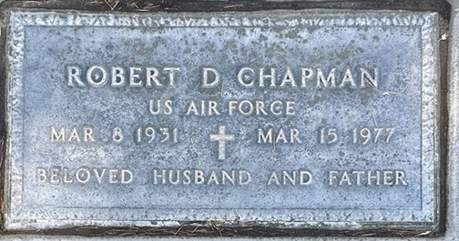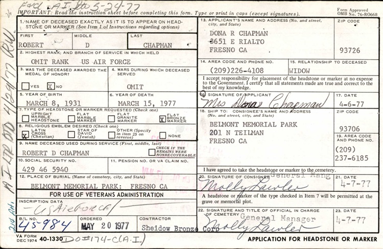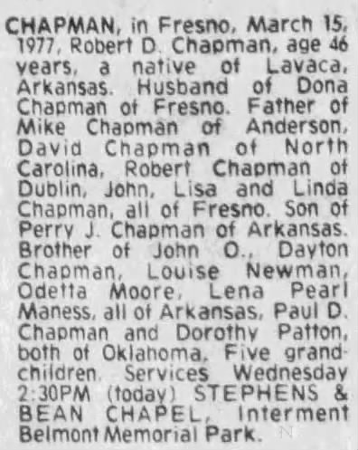 Robert "Bobby" Dewitt Chapman was born March 15, 1977 at Lavaca, Sebastian Co., Ar. to John Perry & Maude Melissa Floyd Chapman. A date has not been found for his marriage to Adona Rae "Dona" Bennett. Bobby enlisted in the US Air Force August 15, 1949. He served until December 30, 1952. Nothing more is known about his service. Bobby passed away March 15, 1977. His burial was in Belmont Memorial Park in Fresno, Fresno Co., California. Fresmp. California March 16, 1977 ![]()
