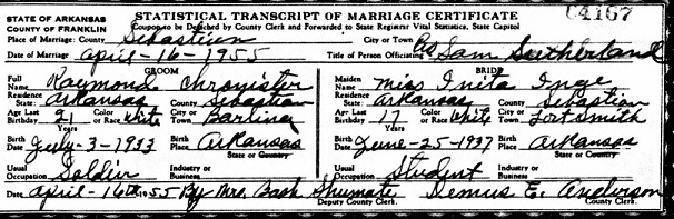 Raymond Winifred Chrinister was born July 3, 1933 at Barling, Sebastian Co., Ar. to
