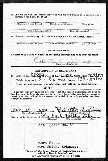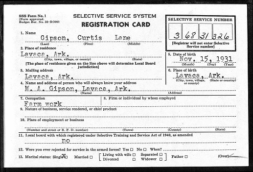 Curtis registered for the military draft November 15, 1949 at Fort Smith,