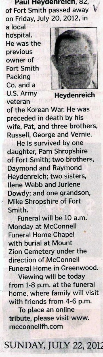 Paul passed away July 20, 2012 at Fort Smith, Sebastian Co., Ar.
