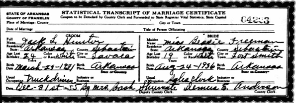 December 21, 1955 he married Bessie Freeman in Franklin Co., Arkansas.