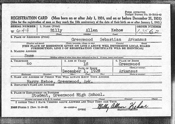 Cpl. Billy Allen Kehoe was born Dec 1, 1928 in Greenwood, Sebastian Co., Ar. to