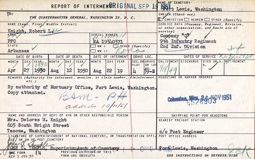 Pfc Robert Lee Knight was buried in Ft. Lewis Post Cemetery at Tacoma, WA.