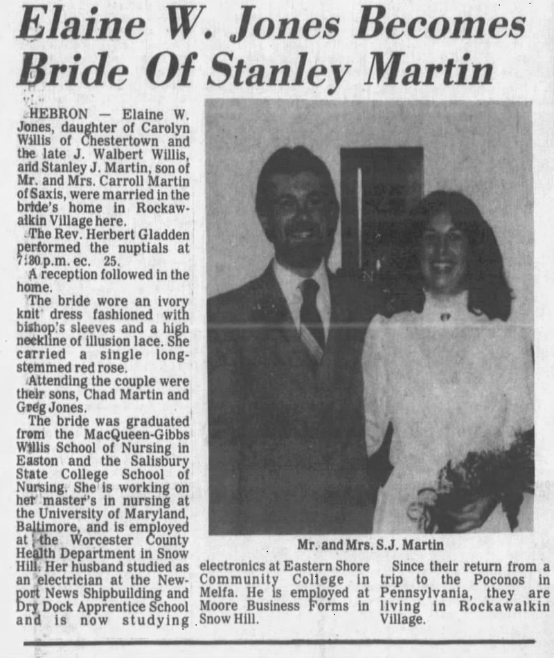 He married Elaine W. Willis Jones at Rockawalkin Village in