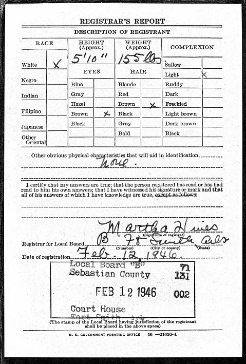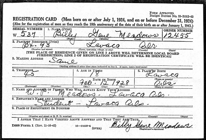 Gene registered for the military draft February 12, 1946 at the Court House in Fort