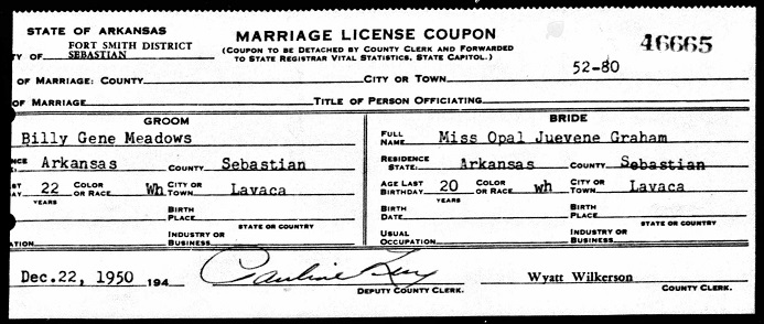 December 24, 1950 he married Opal Juevene Graham at Lavaca, Arkanas. Both were