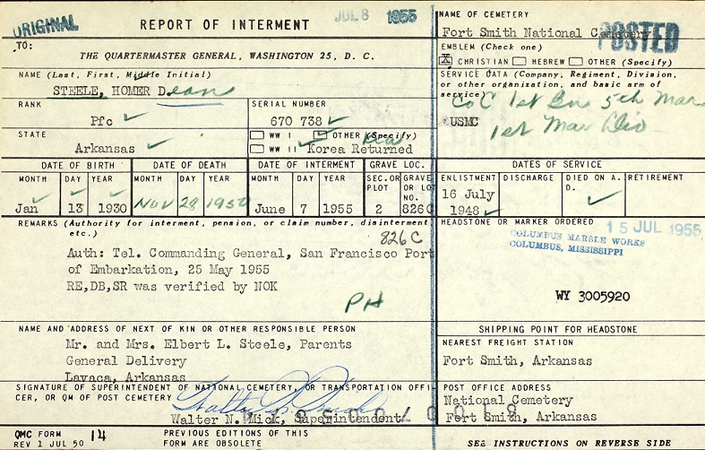 Pfc Homer Dean Steele was born 13 Jan 1930 in Franklin County, Arkansas to