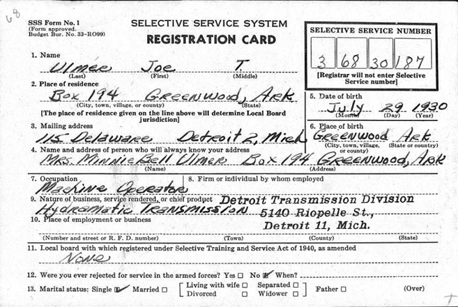 Joe T. Ulmer was born July 29, 1930 at Greenwood, Sebastian Co., Ar. to