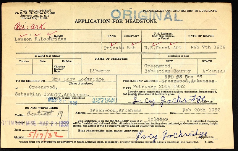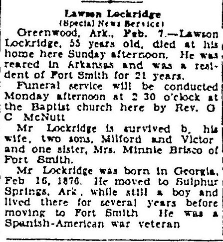 Lawson Roscoe Lockridge was born February 16, 1876 in Sebastian Co., Ar. to