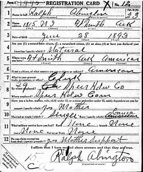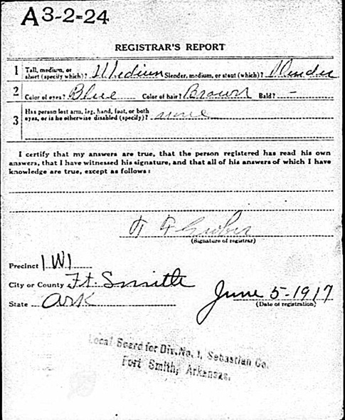 Ralph registered for the military draft June 5, 1917 at Fort Smith, Ar.
