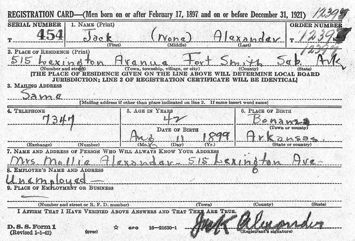 Jack Alexander was born August 11, 1899 in Bonanza, Sebastian Co., Ar. to Charles Newton &
