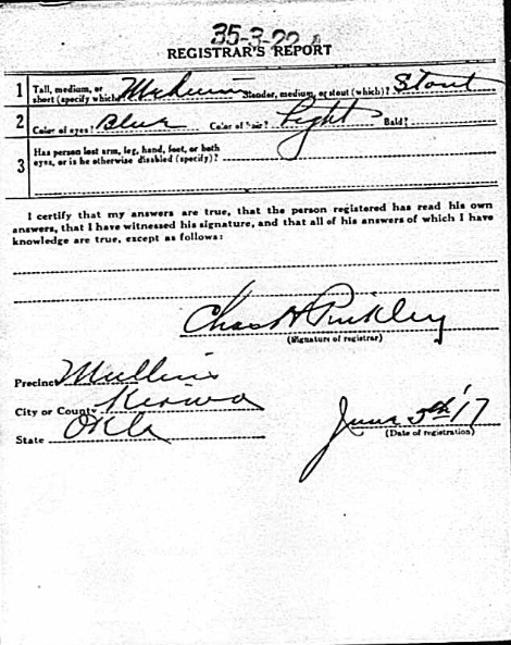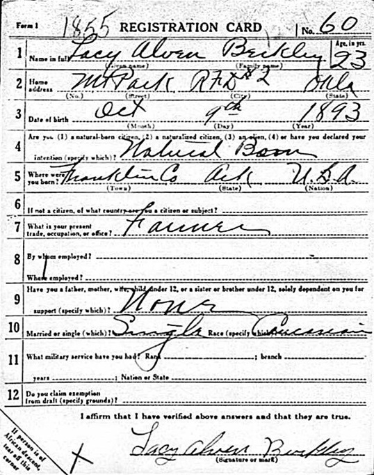 Lacy registered for the military draft June 5, 1917 at Kiowa, Oklahoma.