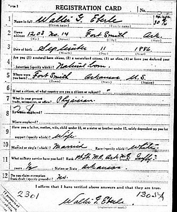 Dr. Eberle registered for the military draft September 29, 1917 at