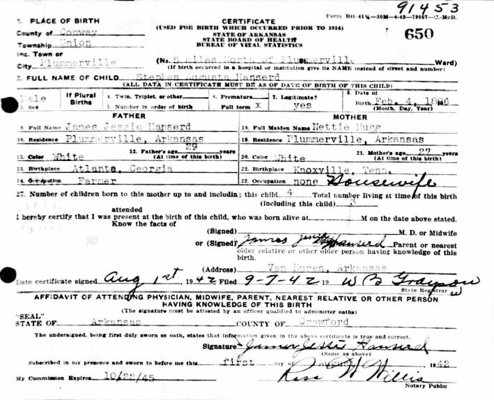Steven Augusta Hanserd was born February 4, 1896 at Plummerville, Conway Co., Ar.