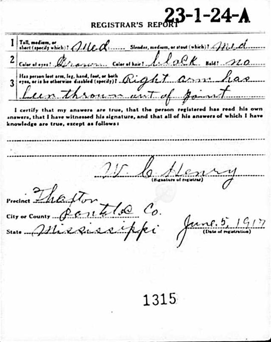Pontotoc Co., Mississippi. He enlisted in the US Army May 28, 1918 and served