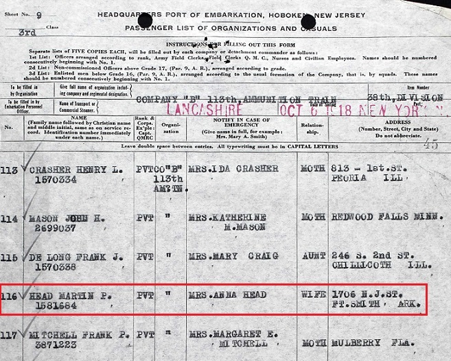 from New York, New York October 6, 1918 on the ship Lancashire for over seas.