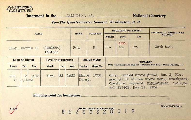 Pvt with Co. B 113 Ark Ammunition Train 38th Div. He left the states
