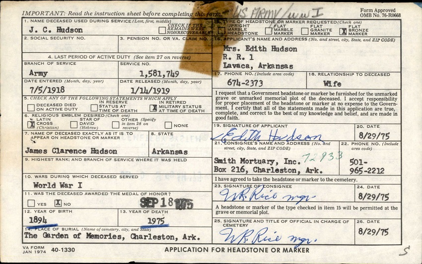 James passed away August 18, 1975 at Lavaca, Sebastian Co., Ar. His burial was