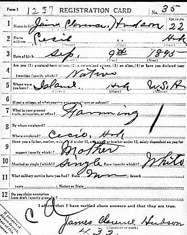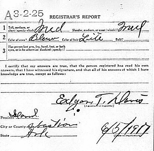 James registered for the military draft June 6, 1917 at Island, Sebastian