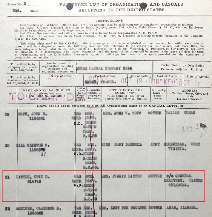 He left Brest France October 19, 1919 and arrived at Hoboken, NJ October