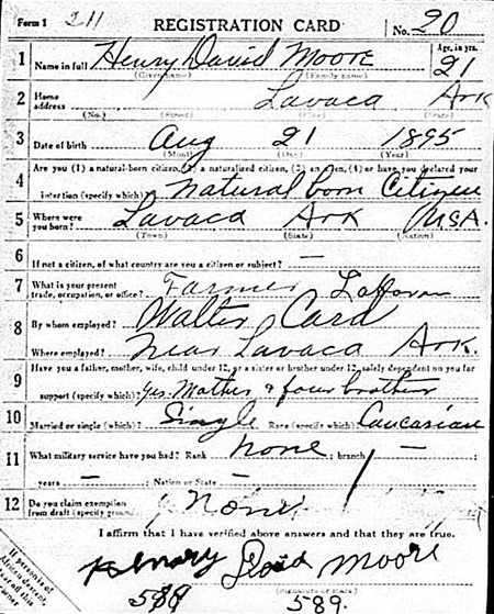 Henry David Moore was born August 21, 1895 at Lavaca, Sebastian Co., Ar. to