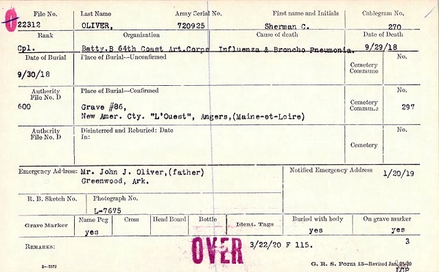 Sherman served with CORP BATTERY B 64 COAST ARTLY. He died at ETLEROY FRANCE. Nothing