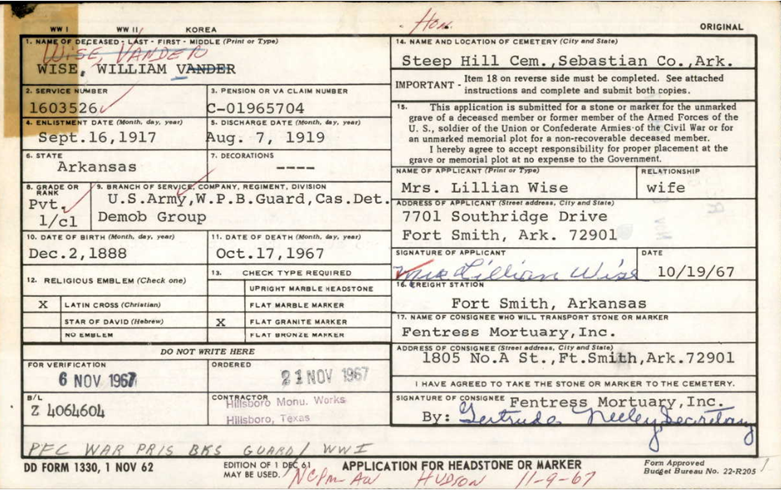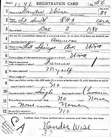 William Vander Wise was born December 2, 1888 in Hot Sptings, Ar. to