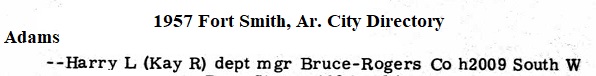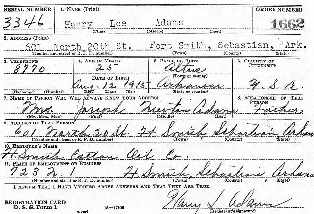 Harry Lee Adams was born August 12, 1915 at Altus, Franklin Co., Arkansas