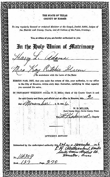 married Kay Ritchie Green in Harris County Texas.