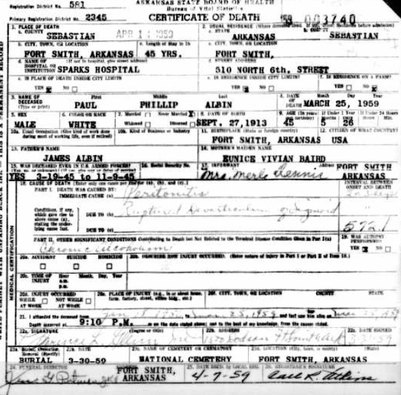 Paul passed away March 25, 1959 at Fort Smith, Arkansas. HIs