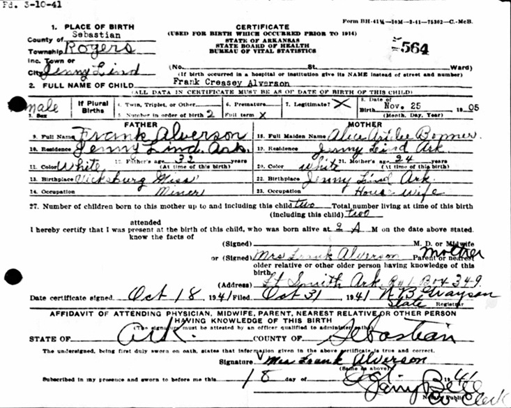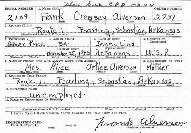 Frank Creasey Alverson, Jr. was born November 25, 1905 at Jenny Lind, Sebastian Co., Ar. to