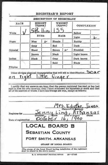 October 16, 1940 Frank registered for the military draft at Jenny Lind. Sebastian Co., Ar.