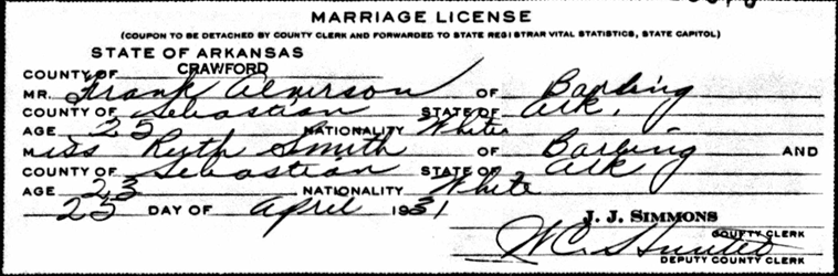 He married Ruth Smith on April 25, 1931 in Crawford Co., Ar. They both resided in