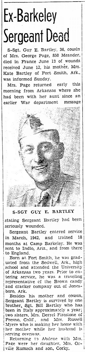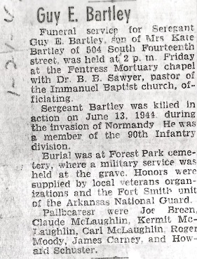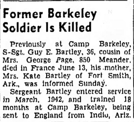 On December 8, 1941, his dad suffered a heart attack and died. His brother, Bill, was training with the 142ndth Field Artillery at Camp Bowie, Texas. The 142nd would become the 936th and 937th Field Artillery. Guy didn't enlist until March 1942; he was helping his mother during this time.