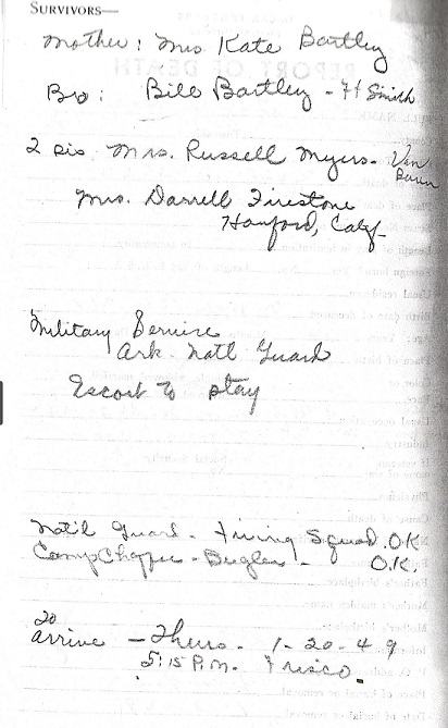 The next day was Sunday, March 29, 1943, a good, no, a great day because he had visitors, family from Arkansas and from Texas. The group included his mother Kate, his sister, Louise and her husband, Russell Myers, his brother, Bill on leave from the 936 Field Artillery. Rounding out the bunch were family from Texas, cousin Zela with her husband George and cousin Virginia and husband, Francisco. Visiting with family was the best way to forget what was to come.