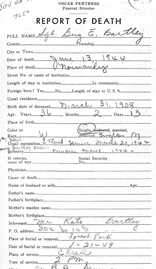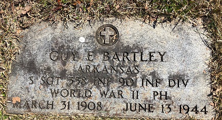 On June 12th, in the hedgerows, close to PONT L'ABBE, during a barrage of artillery fire, Guy was hit in the temple and face and was removed to a Field Hospital where he died the next day, June 13th.
