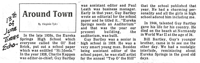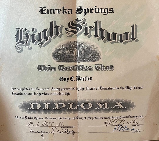 Guy and Lois started school in Nowata, Oklahoma from 1916 to 1918, then attended schools in Rogers, 1918 to 1920, Fayetteville, 1921 to 1926 finishing out his schooling in Eureka Springs, graduating in 1928.