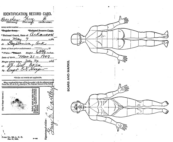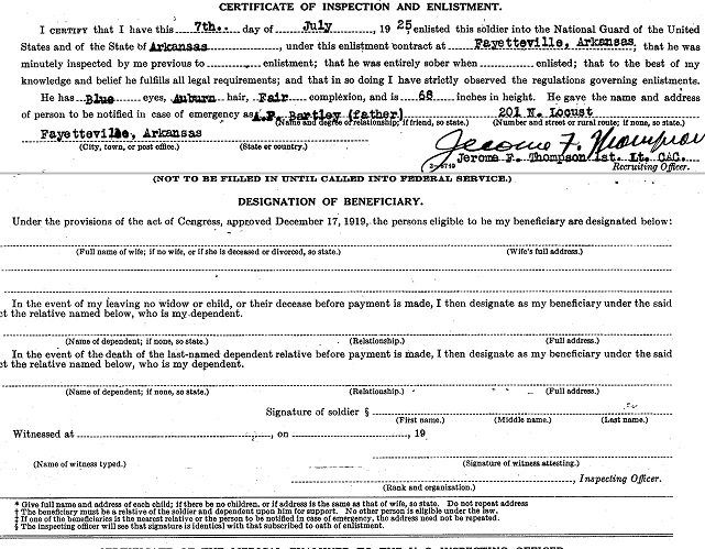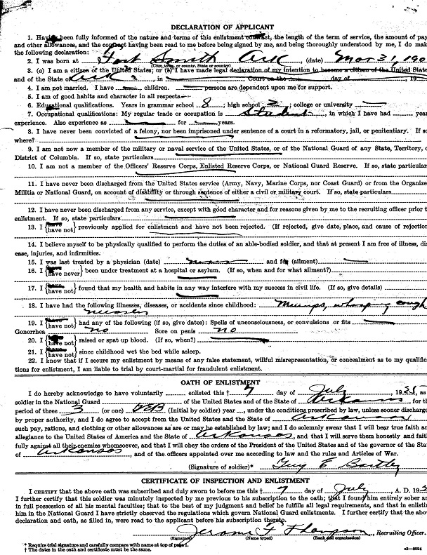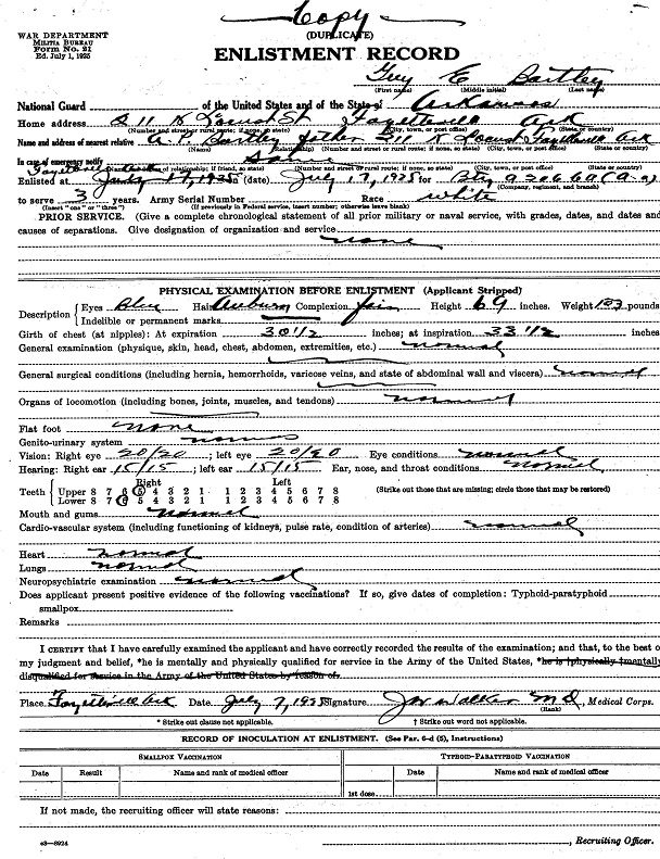 Records show Guy's enlistment date as March 21, 1942, but his serviceman's diary states that they left Fort Smith on March 20, 1942, with a bus load of 63 men headed for Camp Robinson, Little Rock to be inducted. He was the only one who had not had a physical, he was 5'9" 130 lbs., with auburn, wavey hair and blue eyes. In his writings he showed the same wit of his brother, Bill. When interviewed for placement, it was rumored that salesmen and teachers were hardest to place, he wrote "ooks like Buck Private in the rear ranks forever for me."