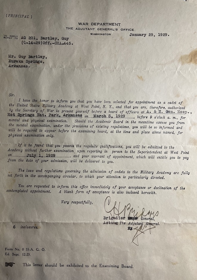 He was at the University of Arkansas for a year or two and in 1929 was offered an appointment at West Point. He thought long and hard about this honor but felt his math skills weren't up to par and politely turned down the appointment.