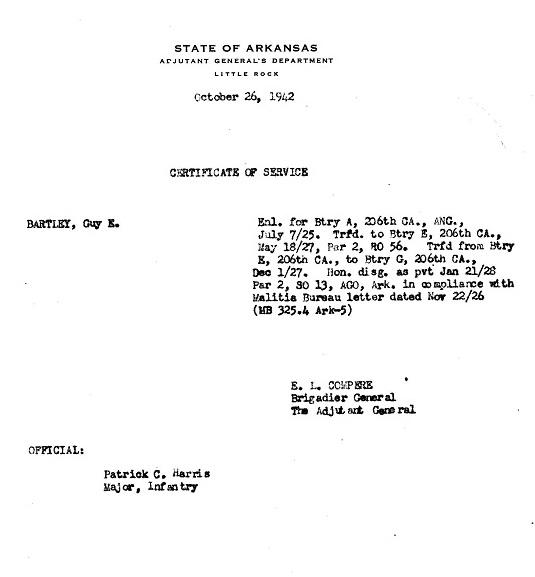 Guy and a few buddies thought it would be a good time to sign up. July 7, 1925, just past his 17th birthday, he joined up for a three-year duration. He was placed in the 206th Coast Artillery (Anti-Aircraft) Regiment, Battery A, transferred to Battery E on May 18, 1927, then Battery G, December 1, 1927, and was Honorably Discharged on January 21, 1928. He had been attending High School during this time, graduating from Eureka Springs High School the 28th day of May 1928.