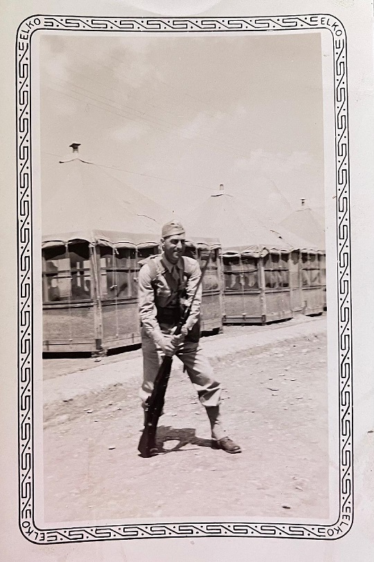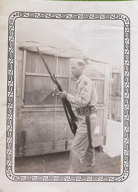 The next stop was Camp Barkley, Texas, near Abilene, 10 miles from cousins that he could visit if he had time. It was 17 weeks of Basic Training. The men marched, drilled, listened to lectures, watched movies, first aid, showing sickening open wounds, avoiding STDs. Guy was rewarded with kitchen police duty (KP), latrine duty and whatever grunt work needed. On April 4, 1942, they were issued their rifles and bayonets - 115 of them that had been packed away since the last war with a heavy coating of Cosmoline that had to be scraped off. It took at least 2 hours to clean each one. The rifles are the 1918 Models and were in excellent shape.