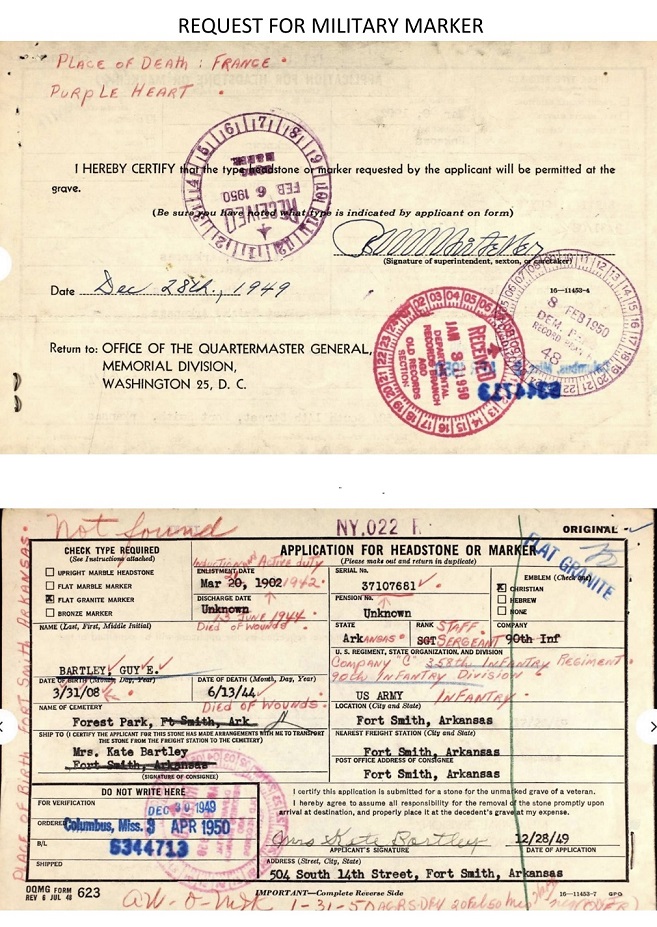 In May 1946, President Truman approved the Return of the Dead Program for families wanting their loved ones remains near, but it was October 1947 that the first remains arrived in the USA. Kate requested that her son be buried by his father, he was reinterred January 21, 1949, at Forest Park Cemetery in Fort Smith. There was a records snafu, they couldn't find him, or the records were incorrect, so his Military Marker was not set until February 1950. Kate joined her husband and son May 17, 1955. Now they rest together forever.