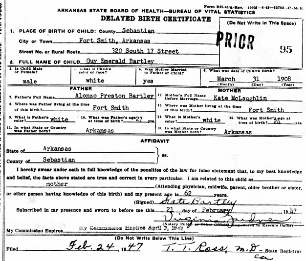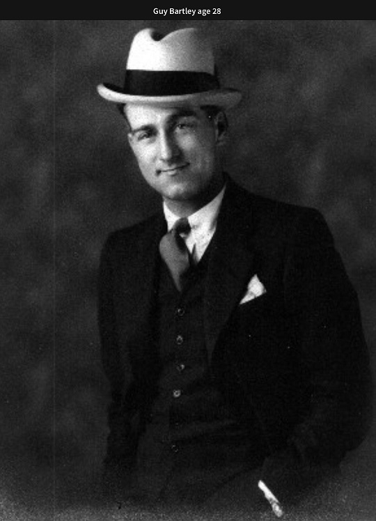 Guy was born in Fort Smith, Arkansas on March 31, 1908, to Alonzo Preston and Kate McLaughlin Bartley. He was the first child for the couple and the "Jewel of his mother's eye", thus the middle name, Emerald. A postcard marked sent at 3:30 pm from the Fort Smith Post Office to his grandfather, William Richard "Dick" McLaughlin, Charleston, Arkansas announces "that a 10 1/2 # boy just arrived, Everything OK, Come, Maud."