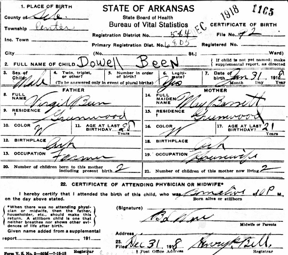 Dewell R. Been was born January 31, 1918 at Center Township, Sebastian Co., Ar. to