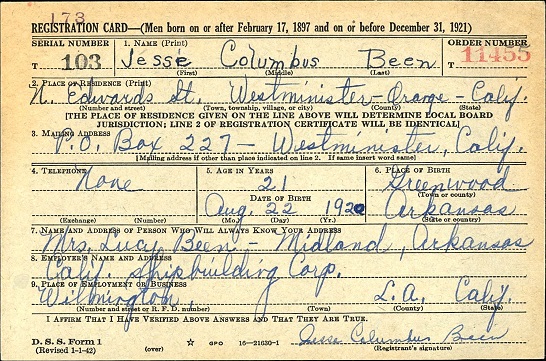 Jesse Columbus Been was born August 22, 1920 at Midland, Sebastian Co., Ar. to
